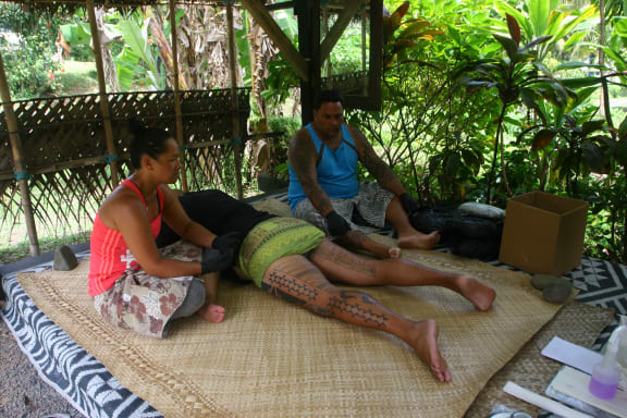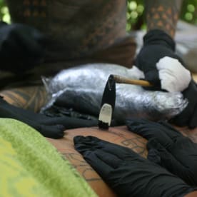 At least two people are needed to stretch the skin tight so the artist can tap the ink patterns into place. Photo RNZ/Daniela Maoate-Cox