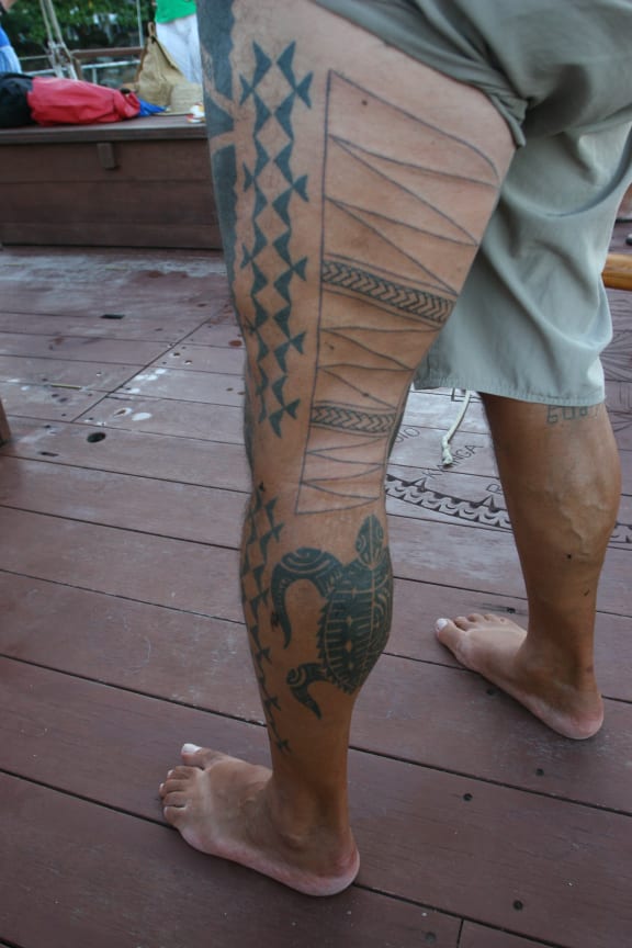 Thomas Tarurongo Wynne shows his tatau on a vaka voyage just a couple of hours after he has had the outline on his left leg completed. RNZ/Daniela Maoate-Cox