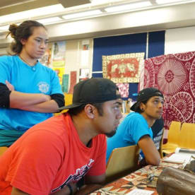 Some eager young men quiz Tetini Pekepo about tatau at Te Papa Tongarewa in Wellington, New Zealand. Photo RNZ/Koroi Hawkins