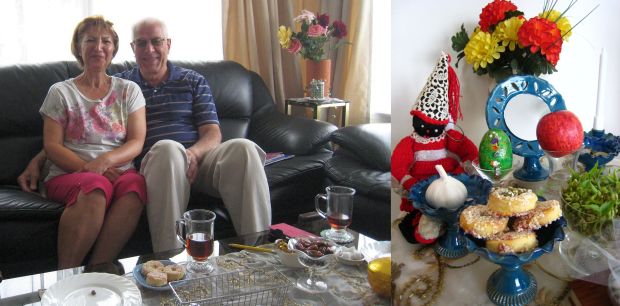 Left: Parri Roshan Gohar and her husband Khosrow Jazayeri. Right: A close-up of Parri and Khosrow’s Haft Sin table, showing a Haji Firuz doll, traditional Iranian pastries, sabzeh or wheat, a sīb or apple and some sīr or garlic.