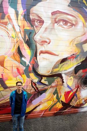 Photo: Misha Uteev a.k.a.Wert 159 in front of his artwork in Samoa House Lane, commissioned by the Alfresco Festival. Photo: Howard Sly