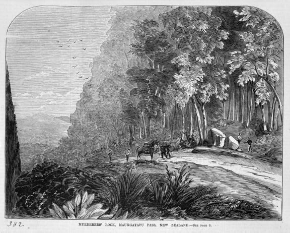 Credit: Murderers’ Rock, Maungatapu Pass, New Zealand, wood engraving by Ebenezer and David Syme, August 27, 1866, State Library of Victoria, Melbourne, Accession No. IAN27/08/66/8