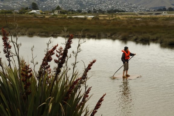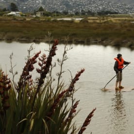 Dry Run, 2016, Performance over 2 hours. Rimu floorboards (kitchen section), polystyrene, paddle, trolley structure, wheel. Dimensions variable. New Brighton Estuary, Christchurch.