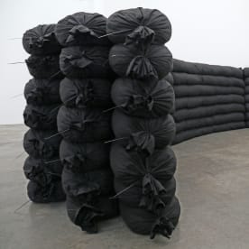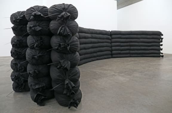 Dead Wood, 2018, Installation. Flood Socks (chip from drowned Pine trees – Brighton estuary, mixed wood chip, EnviroCore filtering felt), plastic ties, ground staples, 1.2 x 1.5 x 8m. A part of Overlay, 2018, Jonathan Smart Gallery, Christchurch.