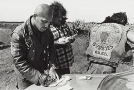 Glenn Jowitt Baldie collecting gang fees, Canterbury Plains, 1979, from the series ‘Black Power, Christchurch’ Gelatin silver print, 333 x 490 mm Purchased 1994 with New Zealand Lottery Grants Board funds, Te Papa, O.003970