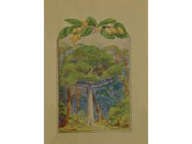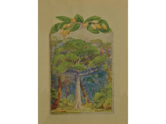 The Karaka Tree, painted by an anonymous artist to accompany prose by Ruth Gardiner, published in The Forerunner, August 1908. Forerunner Press (established 1907, closed 1914). Gifted by Mrs von Dadelszen. Collection of Hawke's Bay Museums Trust, Ruawharo Tā-ū-rangi, 63052