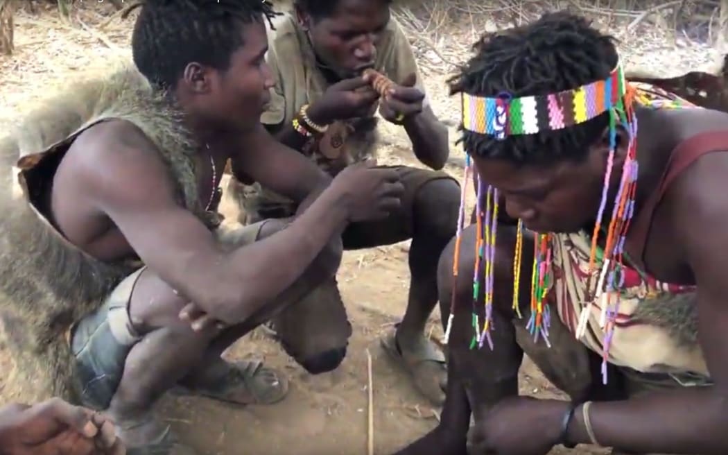 Some Hadza men share a smoke before leaving on a hunting trip. Photo: YouTube