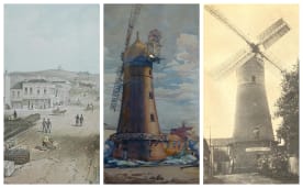 L to R Partington's Mill on Auckland's skyline 1852, Partington's Mill 1947, and a photo of the mill in 1950 just before its destruction