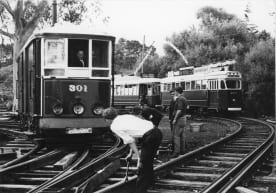 Opening day at MOTAT on 16 December 1967. Alan Curtis double-checks that the tram is not in any danger of derailing. Photo: Graham Stewart