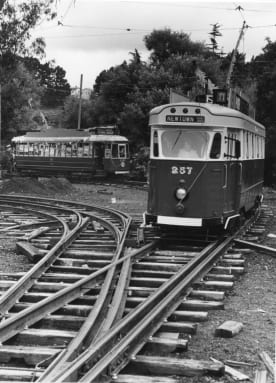 Trams on the move at MOTAT for the opening of the Tramway 16 December 1967. The WANGANUI 10 arrives, Photo: Graham Stewart
