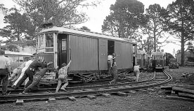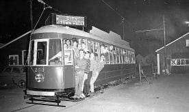 Auckland No 253’s first test run under power at MOTAT on the evening of Friday 24 November 1967 with Ian Stewart at the controls and many more tramway builders and pioneers in the background. The 600-volt Direct Current was supplied by the Auckland Regional Authority’s trolley-bus reticulation system, initially from the Point Chevalier Substation. Photo: Graham Stewart
