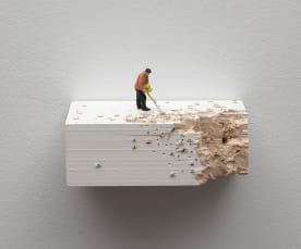 • Liliana Porter, The Task 2015, (installation view), figurine on wooden base (full of holes). Auckland Art Gallery Toi o Tāmaki