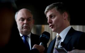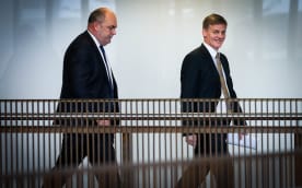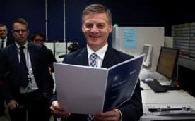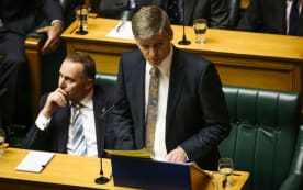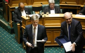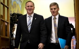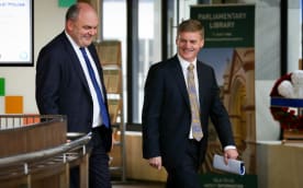 Steven Joyce (left) and Bill English arriving at the lock-up - where about 160 journalists and analysts are waiting.