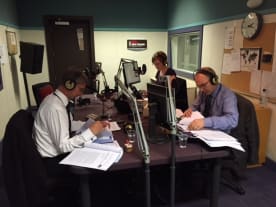Radio New Zealand's economics correspondent Patrick O'Meara, host Susie Ferguson and political editor Brent Edwards in the studio.