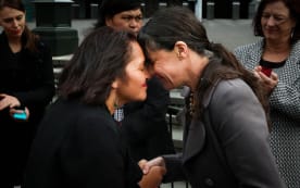 Maori Party MP Marama Fox (left) and ActionStation director Marianne Elliott hongi after the delivery of a petition calling for a Budget to end child poverty.