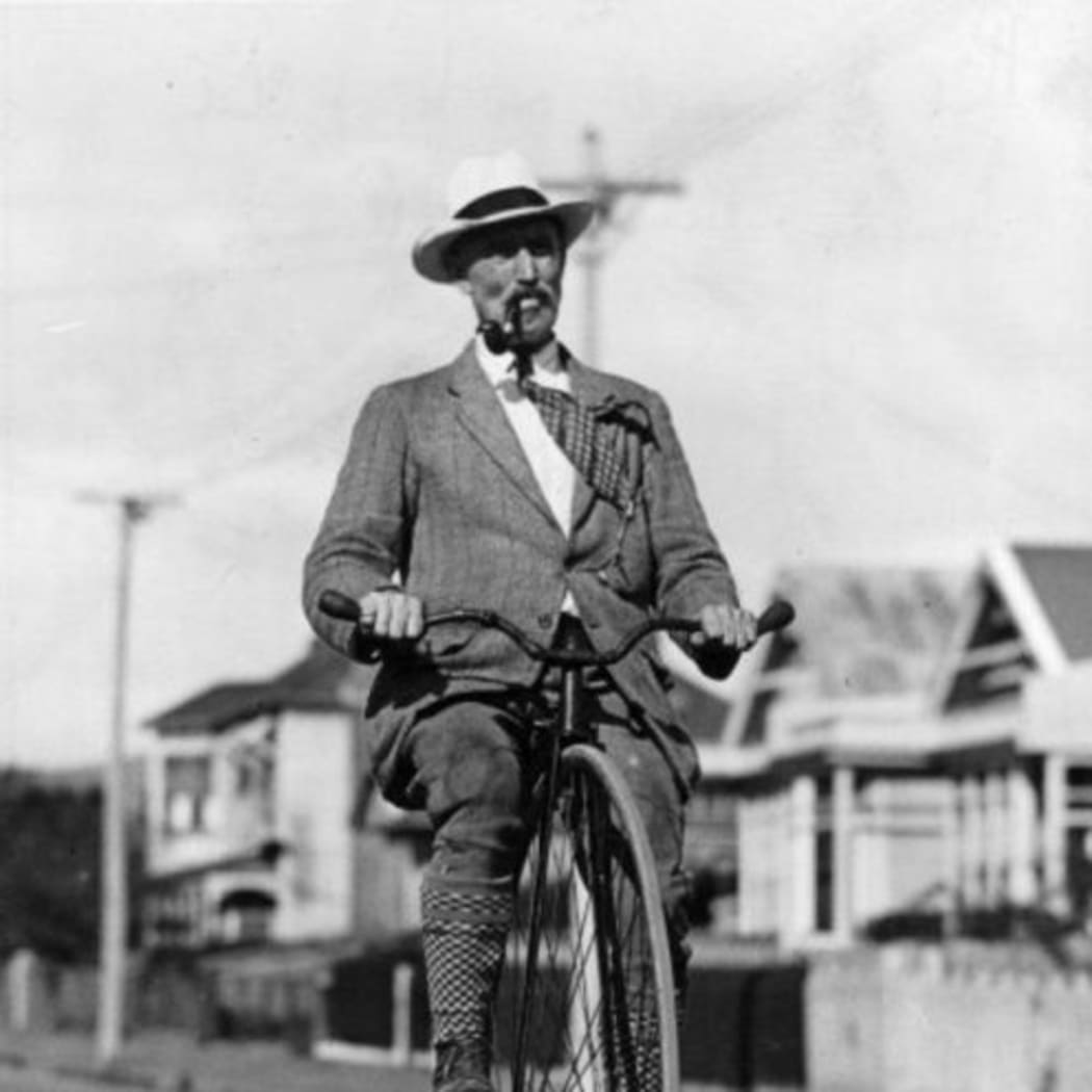 Mansell, Phil, fl 1929. Phil Mansell on his penny farthing bicycle. Ref: 1/2-046073-F. Alexander Turnbull Library, Wellington, New Zealand. http://natlib.govt.nz/records/230437795 Photo: