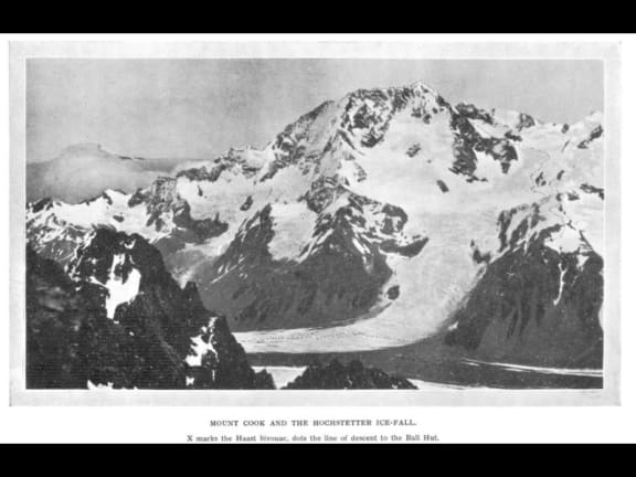 Mount Cook and The Hochstetter Ice-Fall. — X marks the Haast Bivouac, dots the line of descent to the Ball Hut.