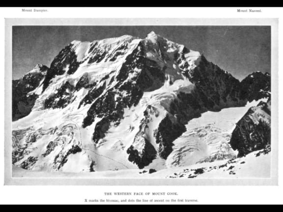 Mount Dampier. Mount Nazomi. — The Western Face Of Mount Cook. — X marks the bivouac, and dots the line of ascent on the first traverse.
