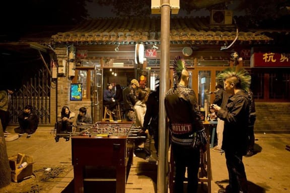 Hell City sport their mohawks outside the Old What Bar, Beijing