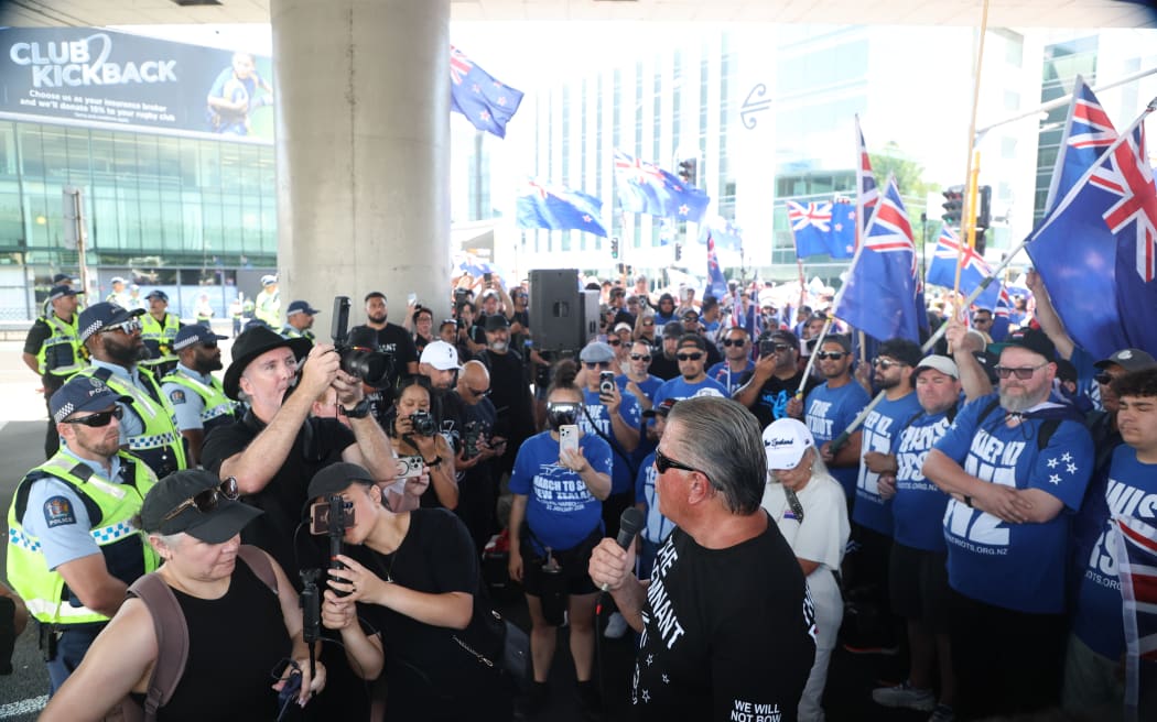 第一起抗议由命运教会负责人Brain Tamaki领导,在当天发表了现场讲话后,他呼吁参与者与他一起进行游行抗议。
