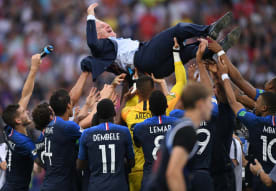 France's players and their head coach Didier Deschamps celebrate the team's 4-2 victory in the World Cup final soccer match. Photo: AFP