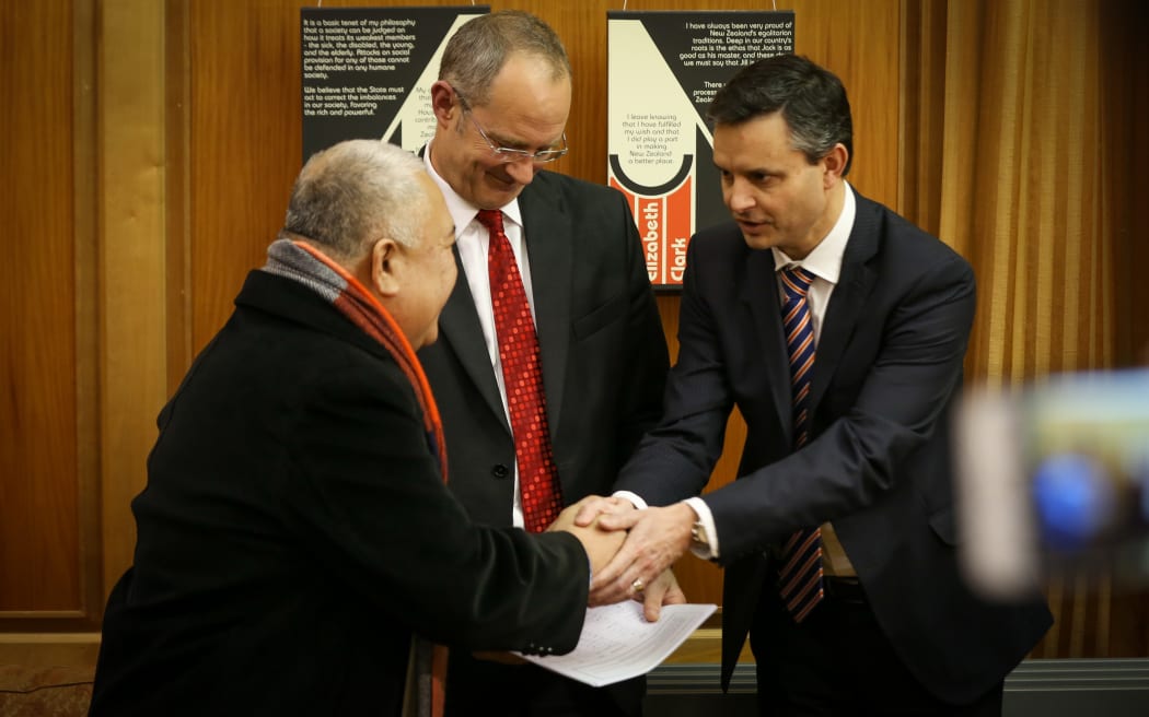 Reverend Iosefa Suamalie (left), Phil Twyford (middle) and James Shaw (right) shaking hands after the climate change petition was passed over today. Photo: RNZ / Alexander Robertson