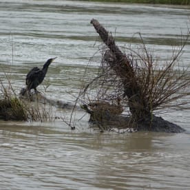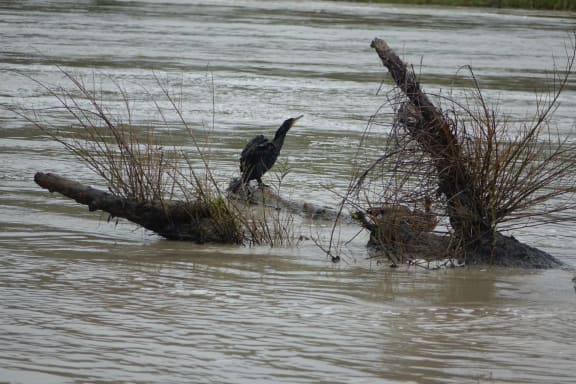 Floodwaters have offered up a feast of eels for this shag on the Whanganui River. Photo RNZ / Robin Martin