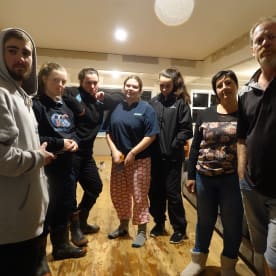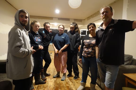 Whanganui's Paul Chapman, right, with the army of volunteers who have helped empty his home ahead of expected flooding. RNZ / Robin Martin
