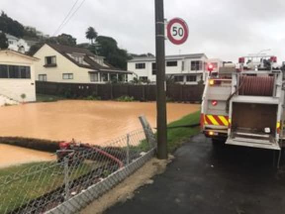 Fire crews at flooded properties on Maraetai Drive, Beachlands, Auckland.