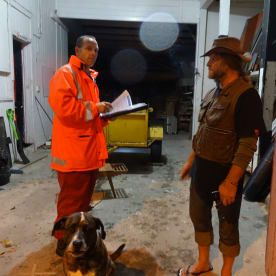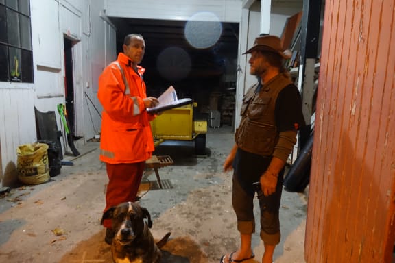 Bruce Tompkin, who had been helping place sandbags for a Taupo Quay businesswoman, talks to civil defence personnel. RNZ / Robin Martin