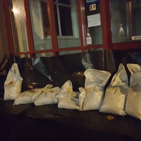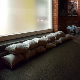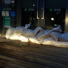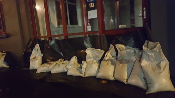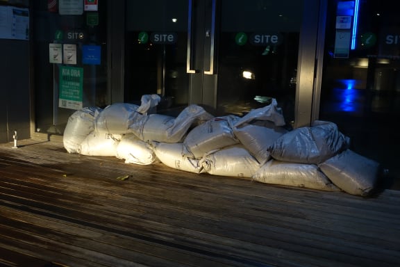 Sandbags outside Sarjeant on the Quay. RNZ / Robin Martin