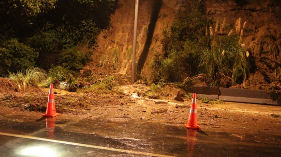 A slip at Tamaki Drive under the Bastion Point look-out in Auckland. RNZ / Mihingarangi Forbes