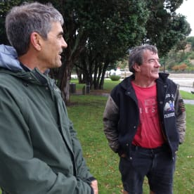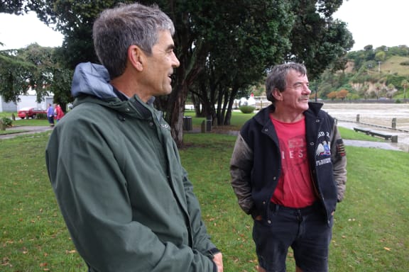 Long time residents Bennett Roach and Austin Hackett reckon the Whanganui River will burst its banks at the next high tide. Photo RNZ / Robin Martin