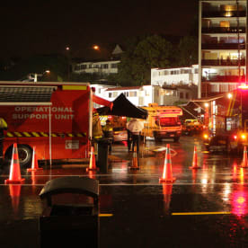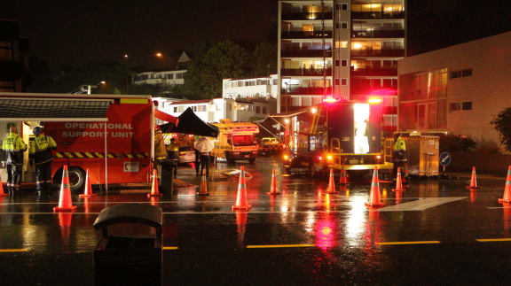 Emergency services at the San Remo apartment block in Kohimarama, Auckland, after a mudslide collapsed onto the building. RNZ / Mihingarangi Forbes