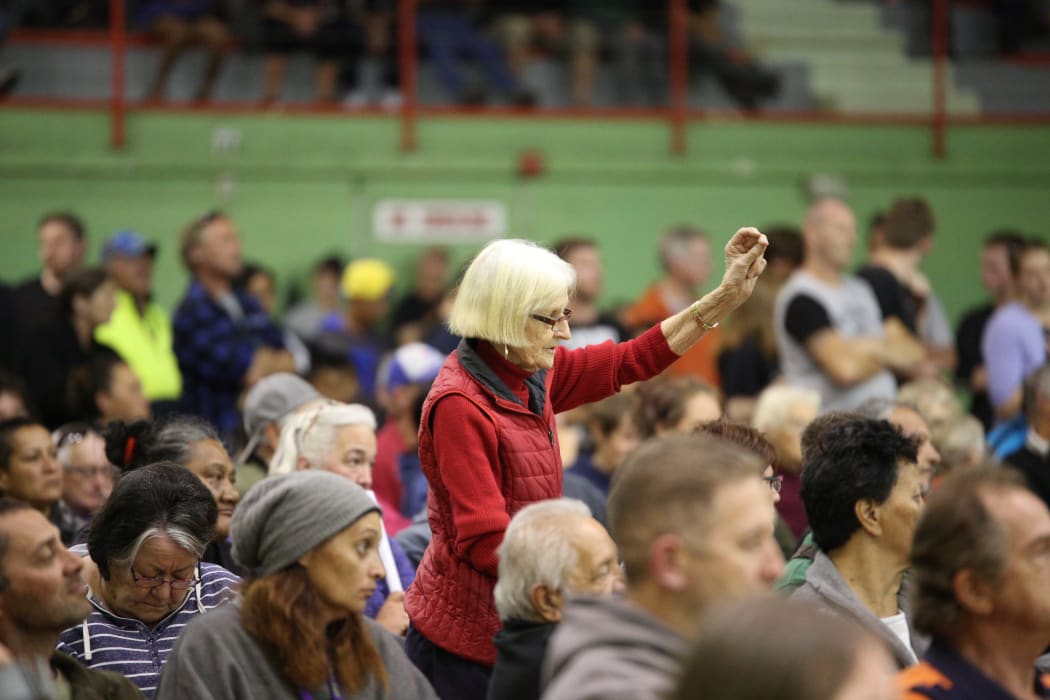 A member of the public questions the council at a public meeting of about 500 people after the flooding at Edgecumbe. Photo: RNZ / Tom Furley