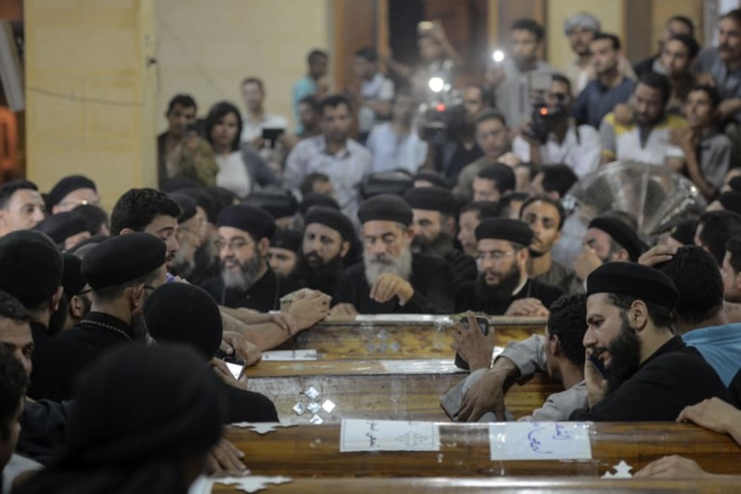 Relatives of the Coptic Christians killed in the attack grieve by the coffins during a funeral. Photo: AFP