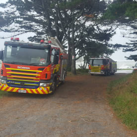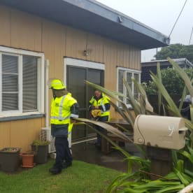 Fire and Emergency staff going door to door preparing to evacuate the Rohuto Block at Waitara, Taranaki. Photo: RNZ / Robin Martin