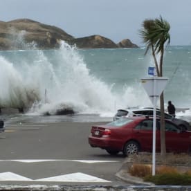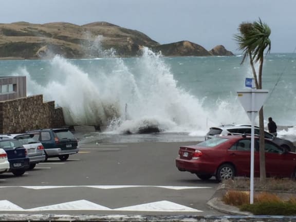 Massive waves smashing into the seawall in Plimmerton, Wellington. Photo: RNZ / John BArr