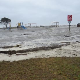 Carters Beach Westport. The sea is normally a couple hundred metres back from there. It has come in over the playing field. You can see the goal posts in the background. Photo: Supplied