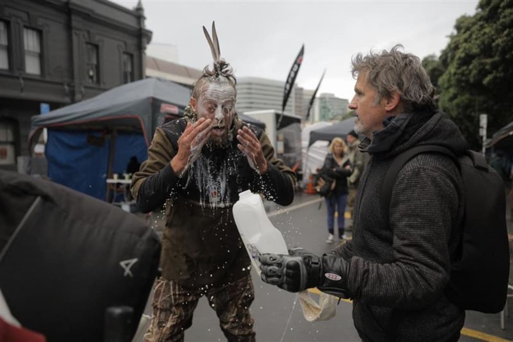 Milk poured over a protester. Photo: RNZ / Angus Dreaver