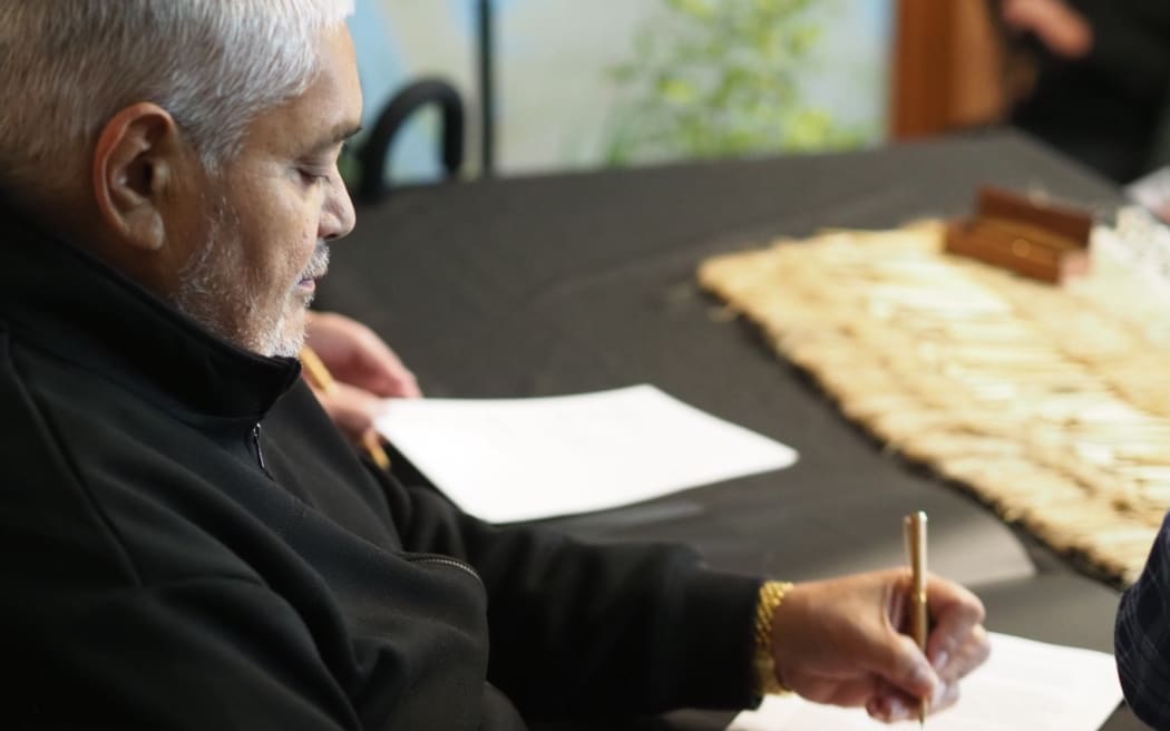 Te Warena Taua, Te Kawera Iwi Settlement Trust Chair, signs the Deed of Acknowledgement on 2 October 2025. Photo: Supplied / Auckland Council