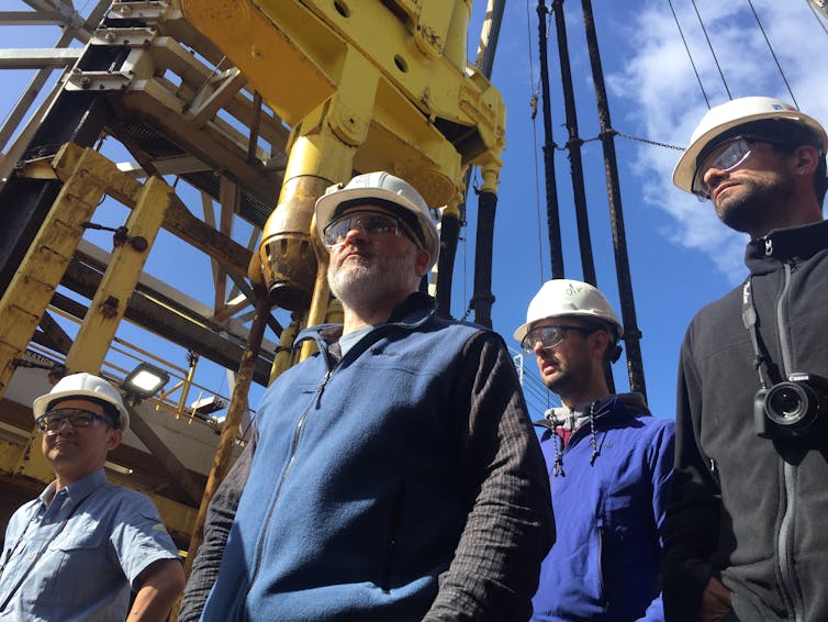 Sanny Saito (Japan), Rupert Sutherland (New Zealand), Thomas Westerhold (Germany), and Edo Dallanave (Italy) on the drill floor of the JOIDES Resolution during an expedition to drill into the hidden continent Zealandia. Photo: Michelle Drake