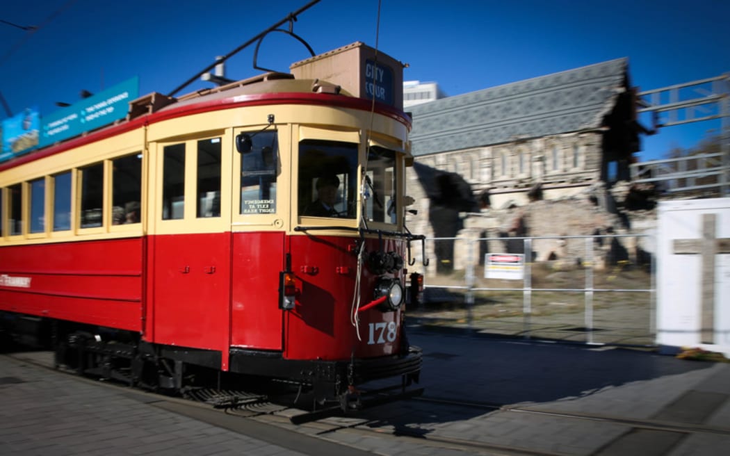 Tram passing the Christchurch Cathedral. Photo: RNZ / Alexander Robertson