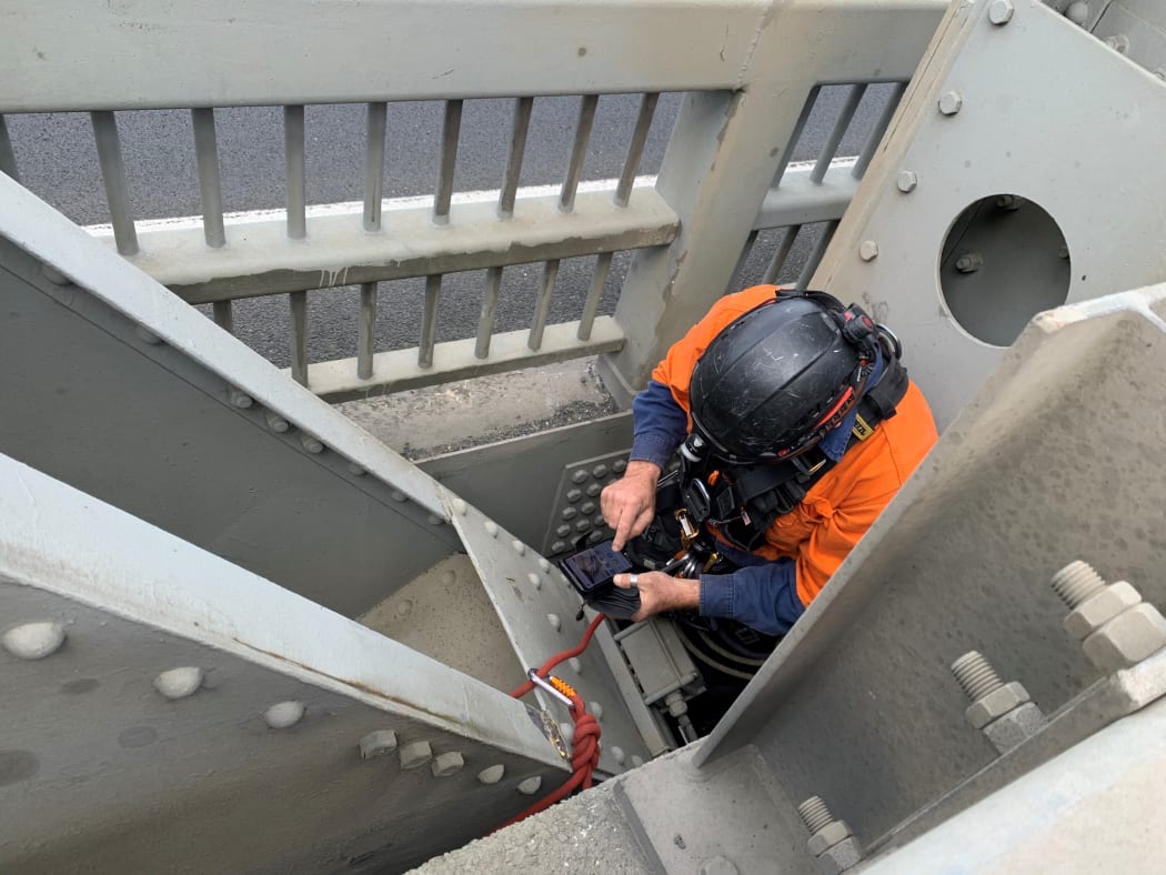Taking photos of damage underneath the bridge. Photo: Eli Orzessek / RNZ