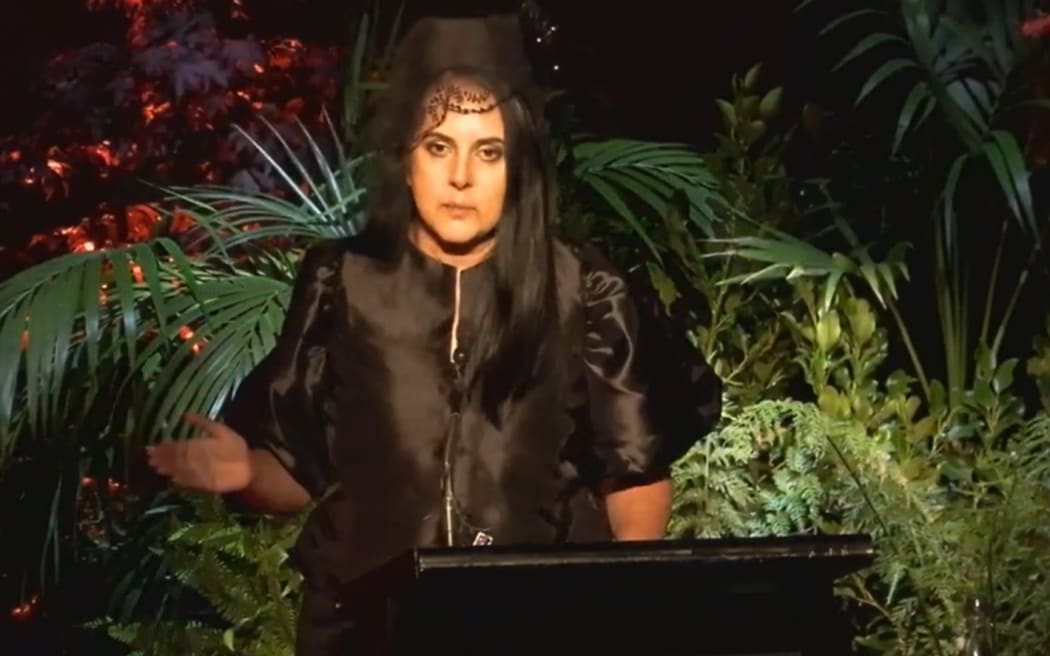 Partner Asha Dutt speaks at Sir Tim Shadbolt's funeral. Photo:
