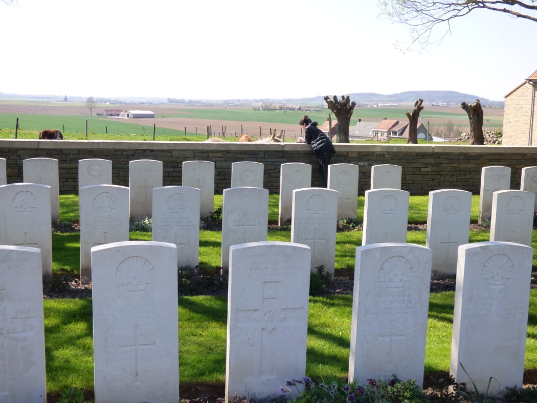 There are no New Zealand dead remembered here. Our High Commissioner back then held out against having our names on the great gate; he wanted memorials that were closer to the actual action. So down the road, for example, at Messines, is a beautifully-kept graveyard surrounded by farmland with paddocks of llamas and ponies, and in the Spring sunshine hazy pastel outlines of distant ridges and copses.