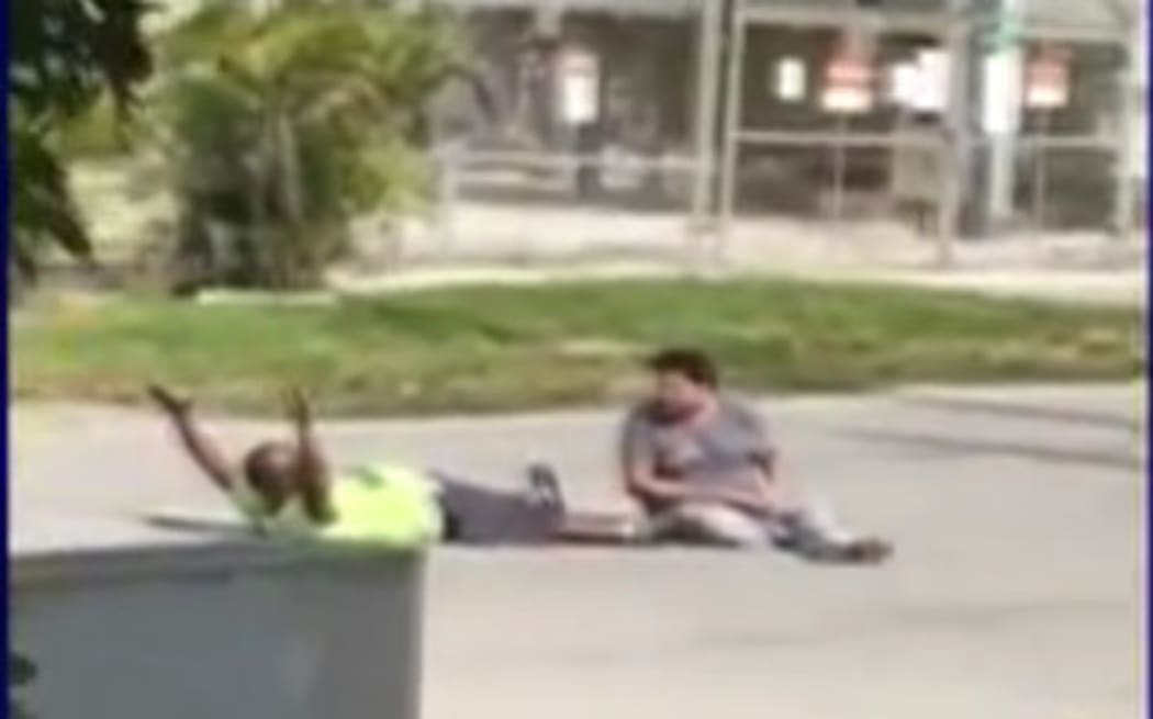 A screenshot of the video showing Charles Kinsey (L) lying on the ground with his hands up. Photo: Twitter: @wsvn